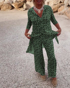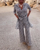 Opt for a refined look with the Karis Geometric Set, featuring a lapel blouse and matching pants. Comfortable and timeless, it's perfect for everyday chic.