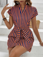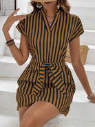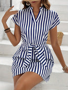 The Madelon Casual Striped Dress blends modern flair with comfortable design for an easy yet eye-catching look. Featuring a notched neckline, short sleeves, and a self-tie waist belt, it flatters your figure while keeping things light and breezy. The mini length adds a youthful touch, making it perfect for casual days out or spontaneous getaways.