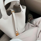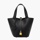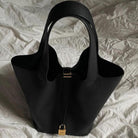 This elegant and versatile bag will effortlessly elevate your style. Its deep, classic bucket design features a higher, wider double handle so it can be carried perfectly in the hand or on the arm. The luxurious feel is enhanced by a simple metal lock and tasteful gold hardware.
